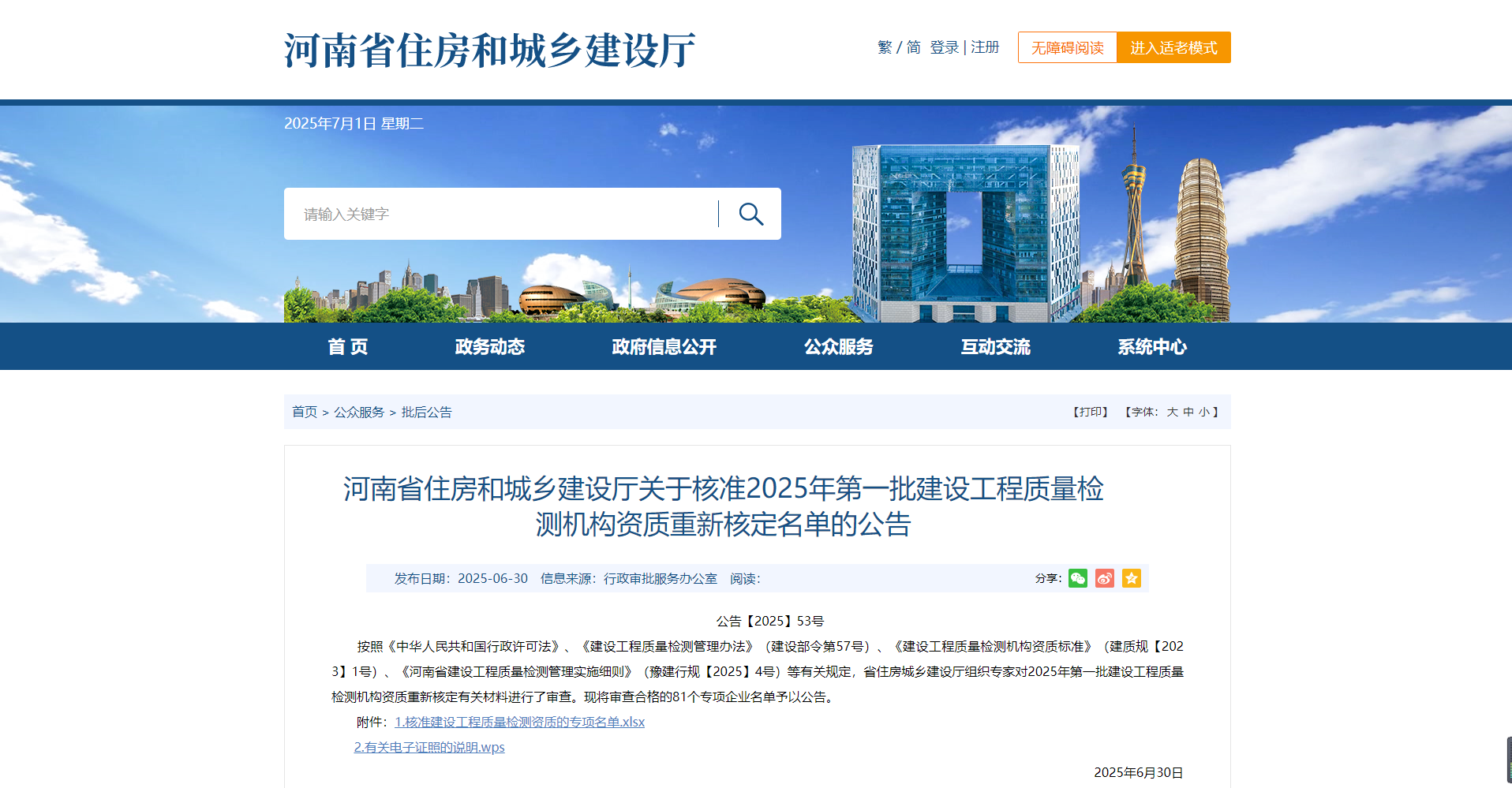 • 熱烈祝賀我司通過河南省住建廳2025年第一批建設(shè)工程質(zhì)量檢測機(jī)構(gòu)資質(zhì)重新核定!!!